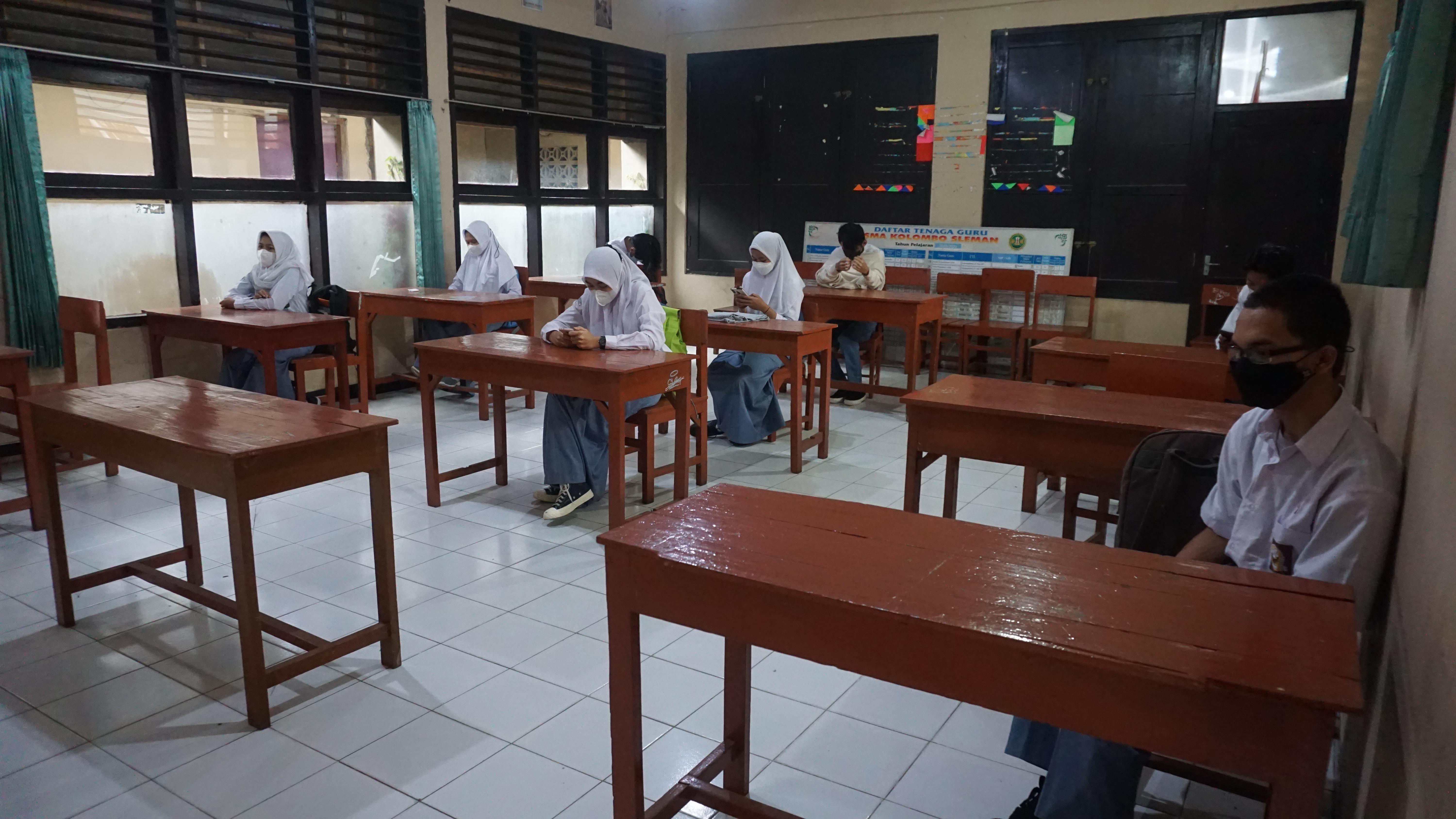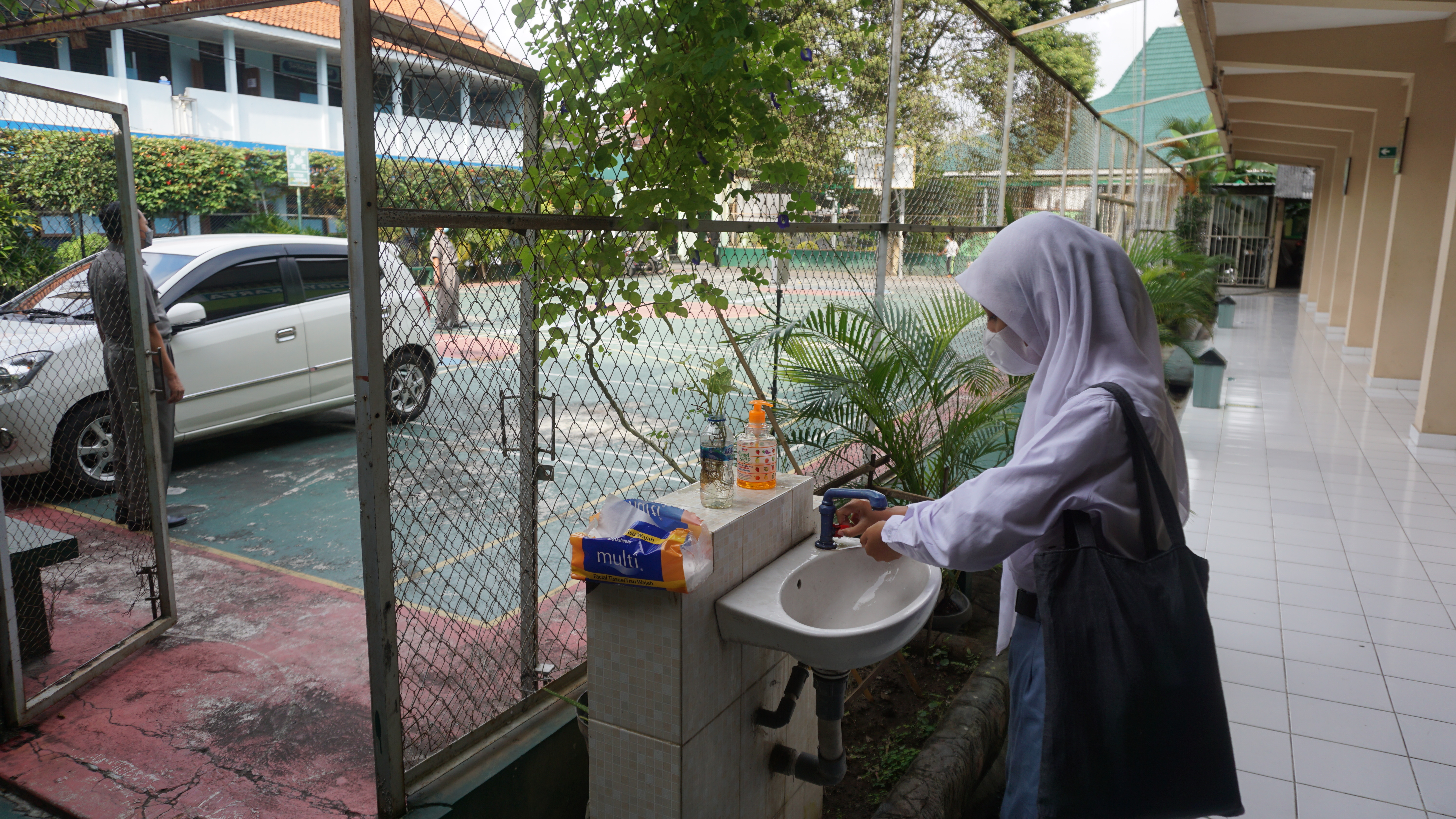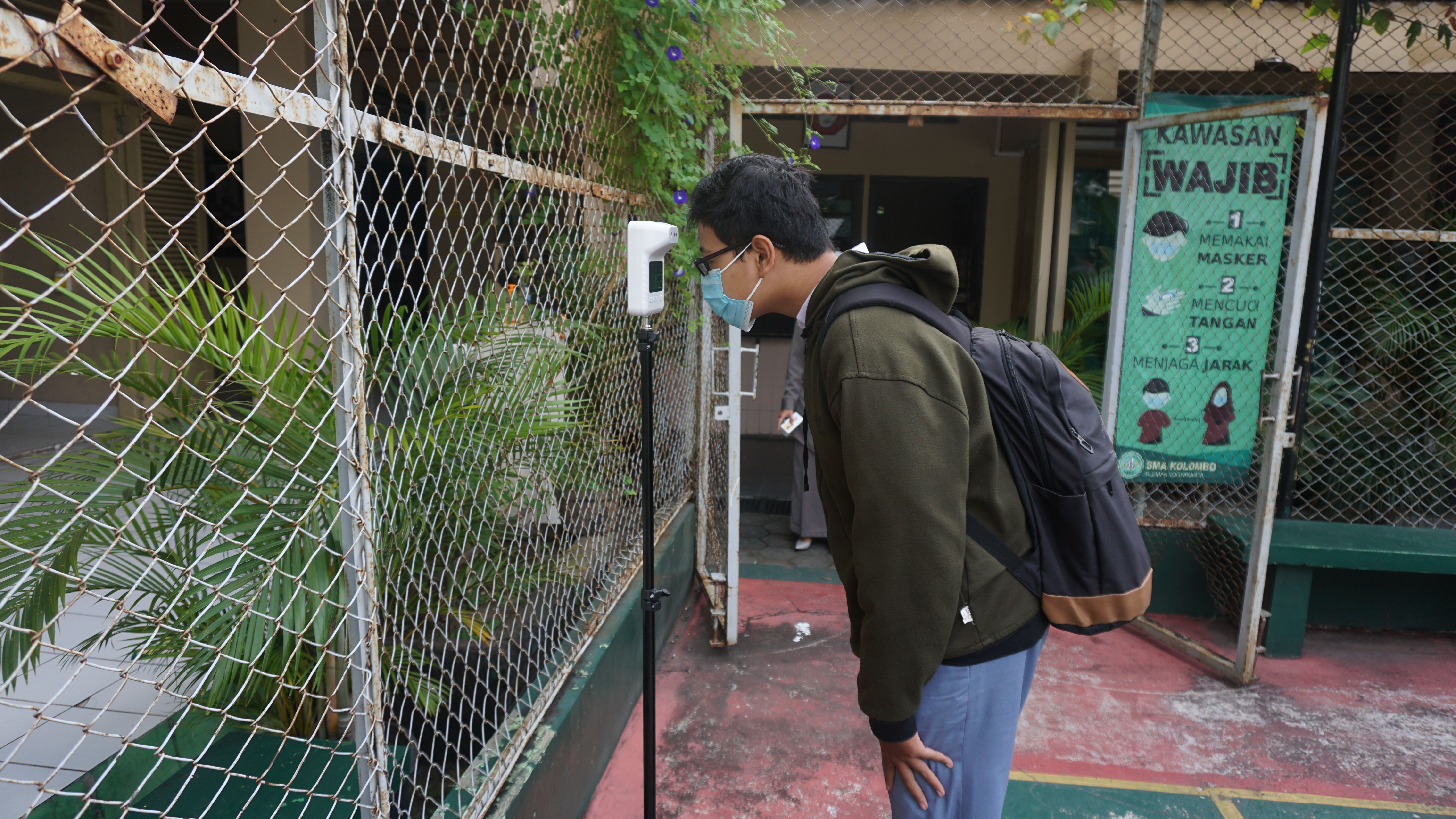 3. Guru, karyawan, dan siswa mematuhi prokes ketat, yaitu dengan screening kesehatan setiap pagi, cek suhu, cuci tangan, jaga jarak, dan memakai masker.